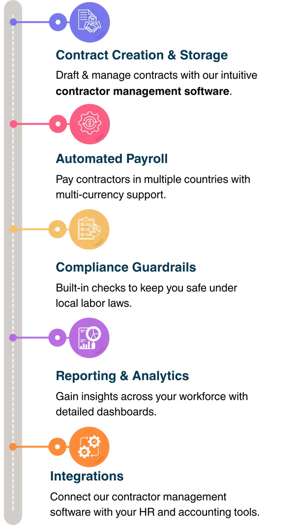 Consolidate your contractor management services into one efficient system. Remire eliminates the need to use multiple tools, providing a centralized platform for all your contractor management needs, from hiring to payroll and compliance, simplifying your workflow and saving valuable time.